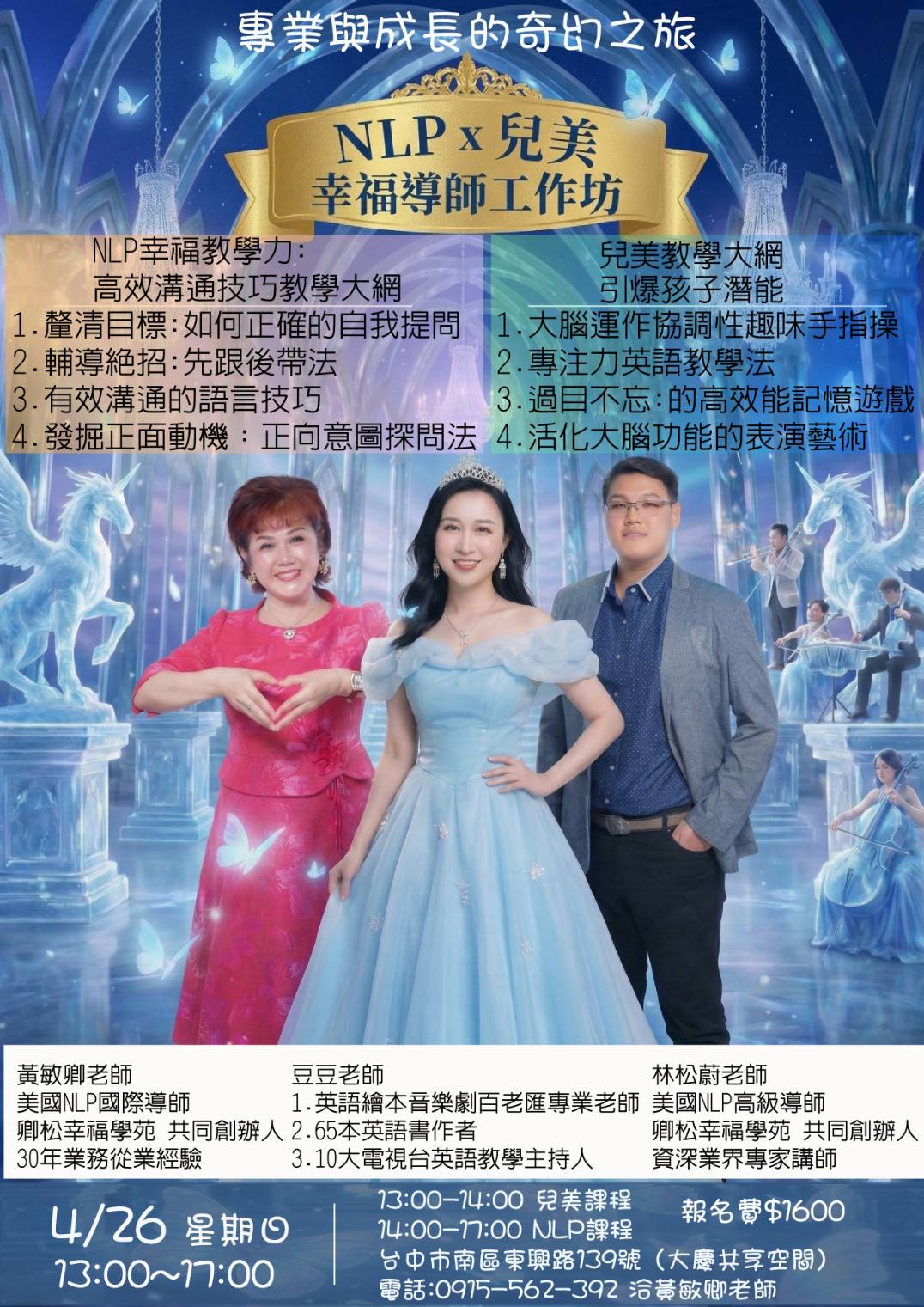 🌈 NLP × 兒美幸福導師工作坊 活化大腦潛能 × 高效教學力一次到位! 你是否希望孩子學得更專注、更快樂? 這場結合 兒童美語教學 × NLP幸福教學力 的工作坊, ✨ 課程亮點 🔸 活化大腦潛能:手指操 × 記憶遊戲 × 表演藝術 不只是教學技巧, 👩🏫 黃敏卿老師 × 豆豆老師 × 林松蔚老師 三位專業講師聯手,融合教學實務與NLP核心技術, 📅 活動資訊 🗓 日期:4/26(日) (13:00–14:00 兒美教學|14:00–17:00 NLP教學力) 這不只是一堂課, 📌 名額有限,歡迎把握機會報名!